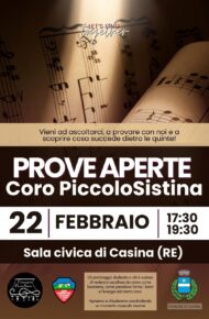 Domenica 22 febbraio 2026, dalle 17.30 alla Sala Civica della Casa della Cultura, il Coro PiccoloSistina apre le prove alla cittadinanza. Un pomeriggio per scoprire il lavoro corale dall’interno e condividere un brano finale insieme ai giovani coristi.