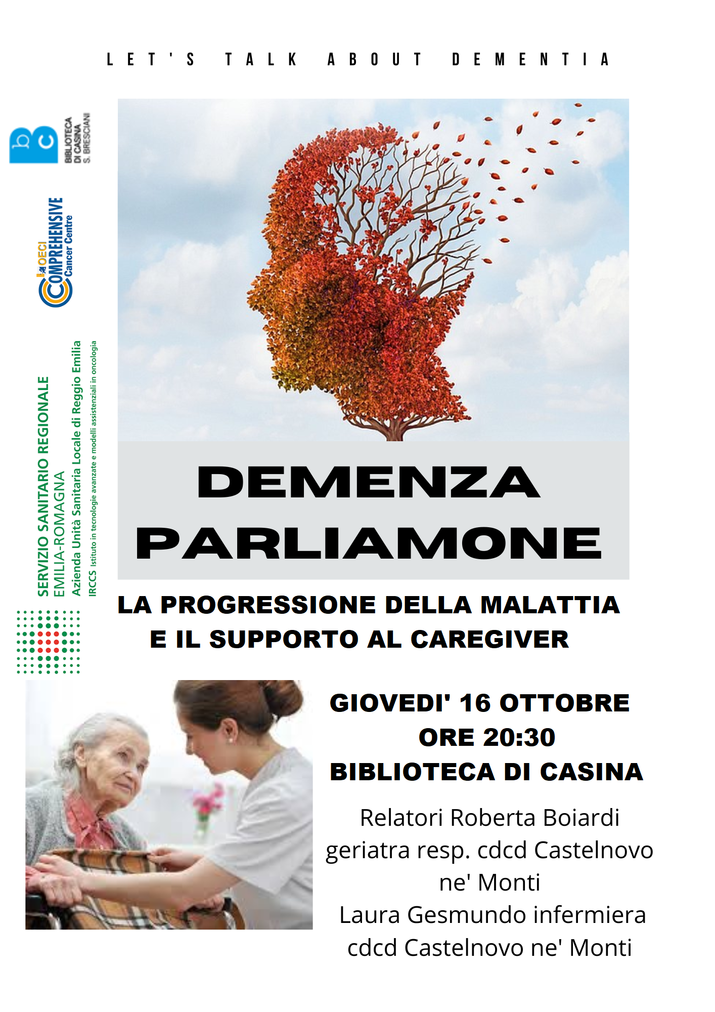 Giovedì 16 ottobre, alle ore 20.30, negli spazi della Biblioteca di Casina si terrà l’incontro “Demenza, parliamone: la progressione della malattia e il supporto al caregiver”.