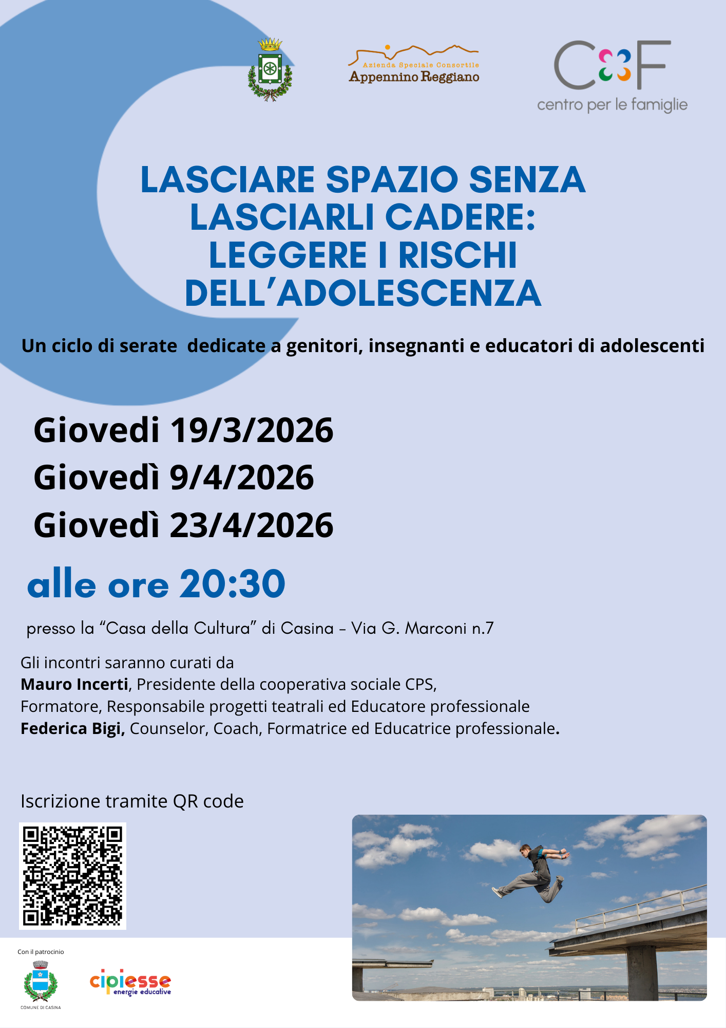 Tre serate dedicate a genitori, insegnanti ed educatori per comprendere e accompagnare l’adolescenza, tra rischi, fragilità e opportunità di crescita. Gli incontri si terranno alla Casa della Cultura di Casina alle ore 20.30.