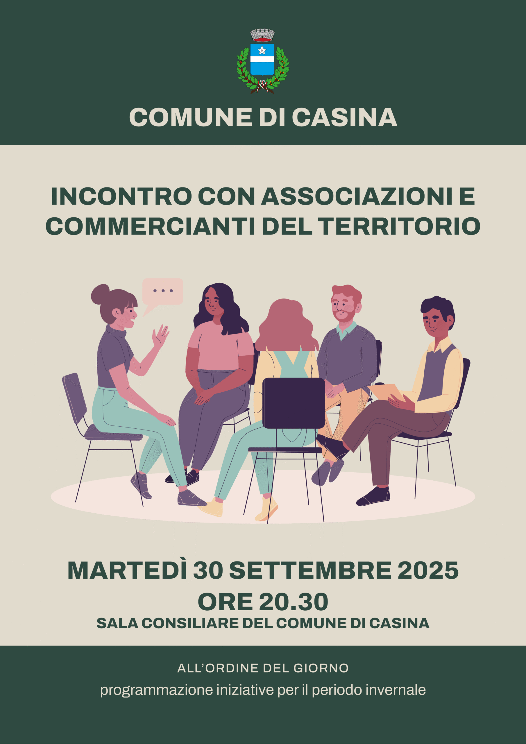 Martedì 30 settembre 2025 alle ore 20.30 incontro con le associazioni e i commercianti del territorio in sala consiliare. All'ordine del giorno la programmazione delle iniziative per il periodo invernale.