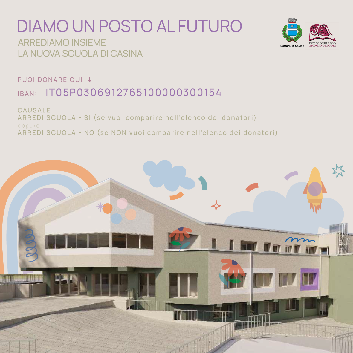 È ufficialmente attiva la raccolta fondi “Diamo un posto al futuro”, il progetto di crowdfunding civico promosso dal Comune di Casina e dall'Istituto comprensivo G. Gregori per sostenere la realizzazione degli arredi della nuova Scuola Secondaria di Primo Grado.