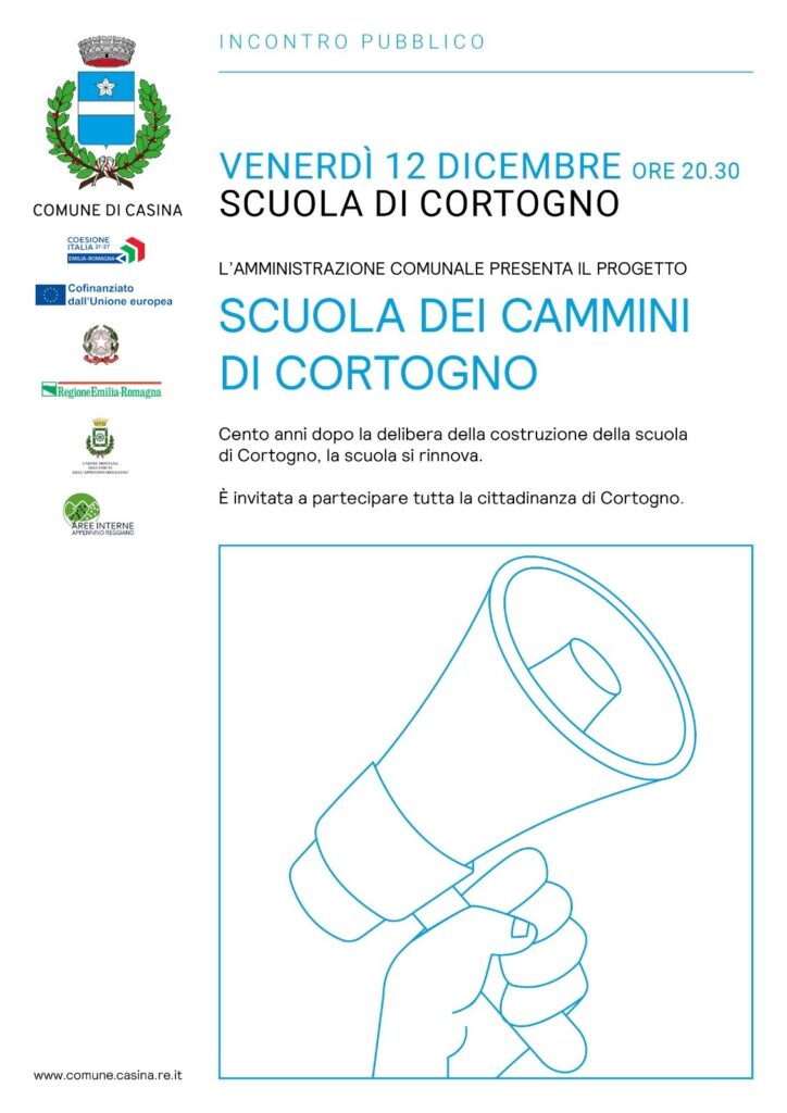 Venerdì 12 dicembre alle ore 20.30 l'Amministrazione Comunale presenta il progetto "Scuola dei Cammini" presso la Scuola di Cortogno, che a cento anni dalla delibera per la costruzione vedrà un rinnovamento. La cittadinanza di Cortogno è invitata a partecipare.