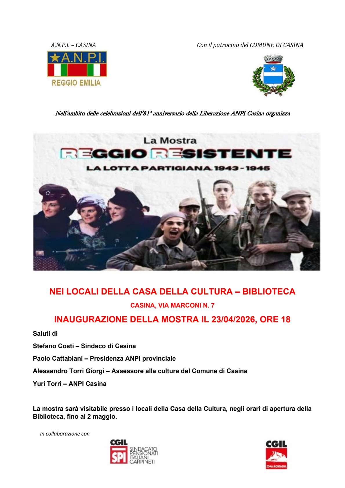 Le celebrazioni prenderanno il via già nella giornata di mercoledì 23 aprile, con l’inaugurazione della mostra “Reggio Resistente. La lotta partigiana 1943-1946”, promossa da ANPI Casina con il patrocinio del Comune e la collaborazione di CGIL. L’appuntamento è fissato alle ore 18 presso la Casa della Cultura – Biblioteca (via Marconi 7), alla presenza del sindaco Stefano Costi, di rappresentanti di ANPI e dell’amministrazione comunale. La mostra sarà visitabile fino al 2 maggio negli orari di apertura della biblioteca.