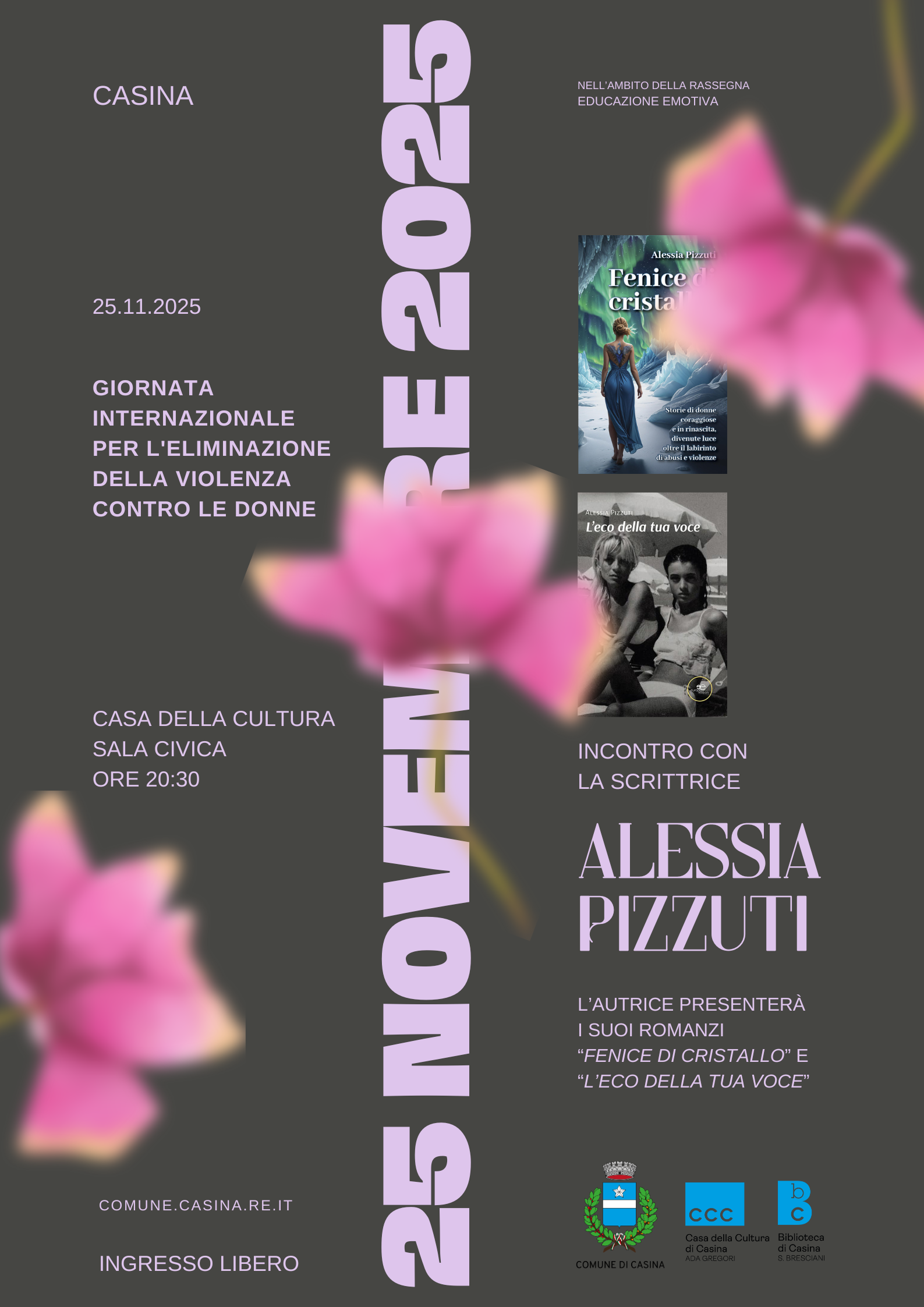 Il 25 novembre alle 20.30 alla Casa della Cultura di Casina incontro con la scrittrice Alessia Pizzuti, che presenterà i romanzi "Fenice di cristallo" e "L’eco della tua voce" nell’ambito della rassegna Educazione Emotiva. Ingresso libero.