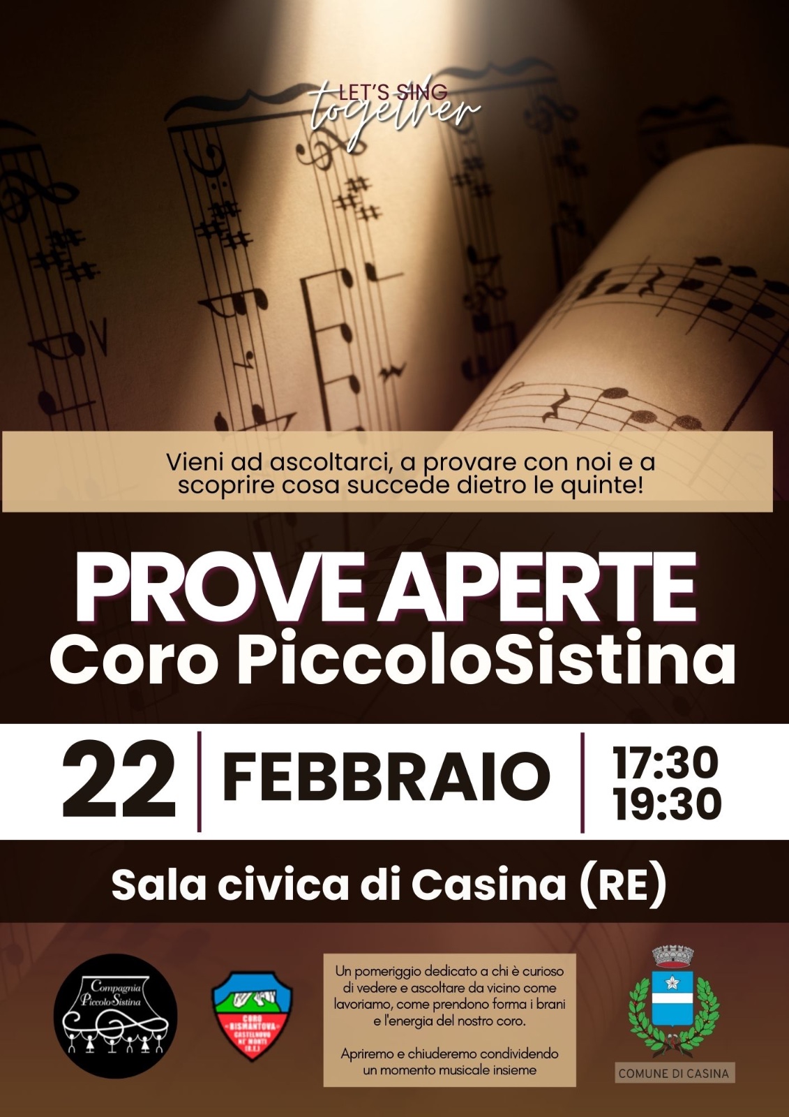 Domenica 22 febbraio 2026, dalle 17.30 alla Sala Civica della Casa della Cultura, il Coro PiccoloSistina apre le prove alla cittadinanza. Un pomeriggio per scoprire il lavoro corale dall’interno e condividere un brano finale insieme ai giovani coristi.