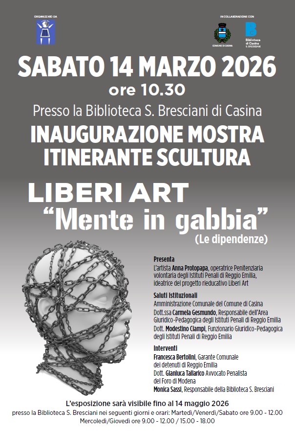 Sabato 14 marzo 2026 alle 10.30 alla Biblioteca di Casina inaugura la mostra itinerante “Mente in gabbia” di Liberi Art, progetto rieducativo negli Istituti Penali di Reggio Emilia dedicato al tema delle dipendenze, a cura di Anna Protopapa.