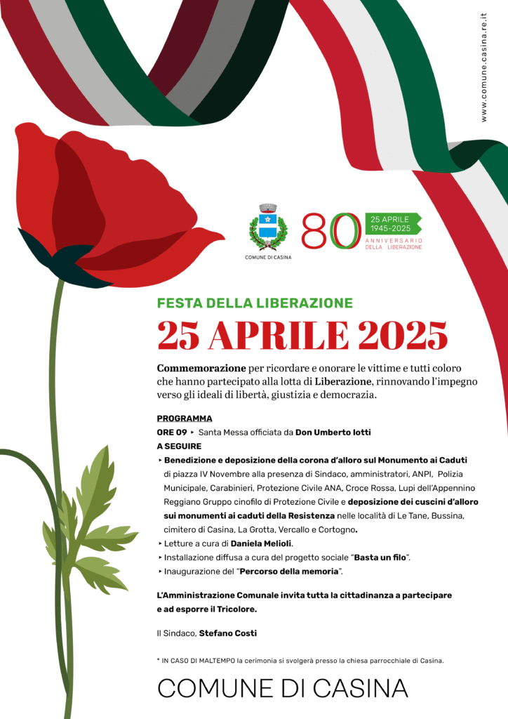 Il Comune di Casina si prepara a celebrare il 25 Aprile, Festa della Liberazione, con una cerimonia commemorativa dedicata alla memoria delle vittime e a tutti coloro che, con coraggio e determinazione, hanno contribuito alla lotta di Liberazione.