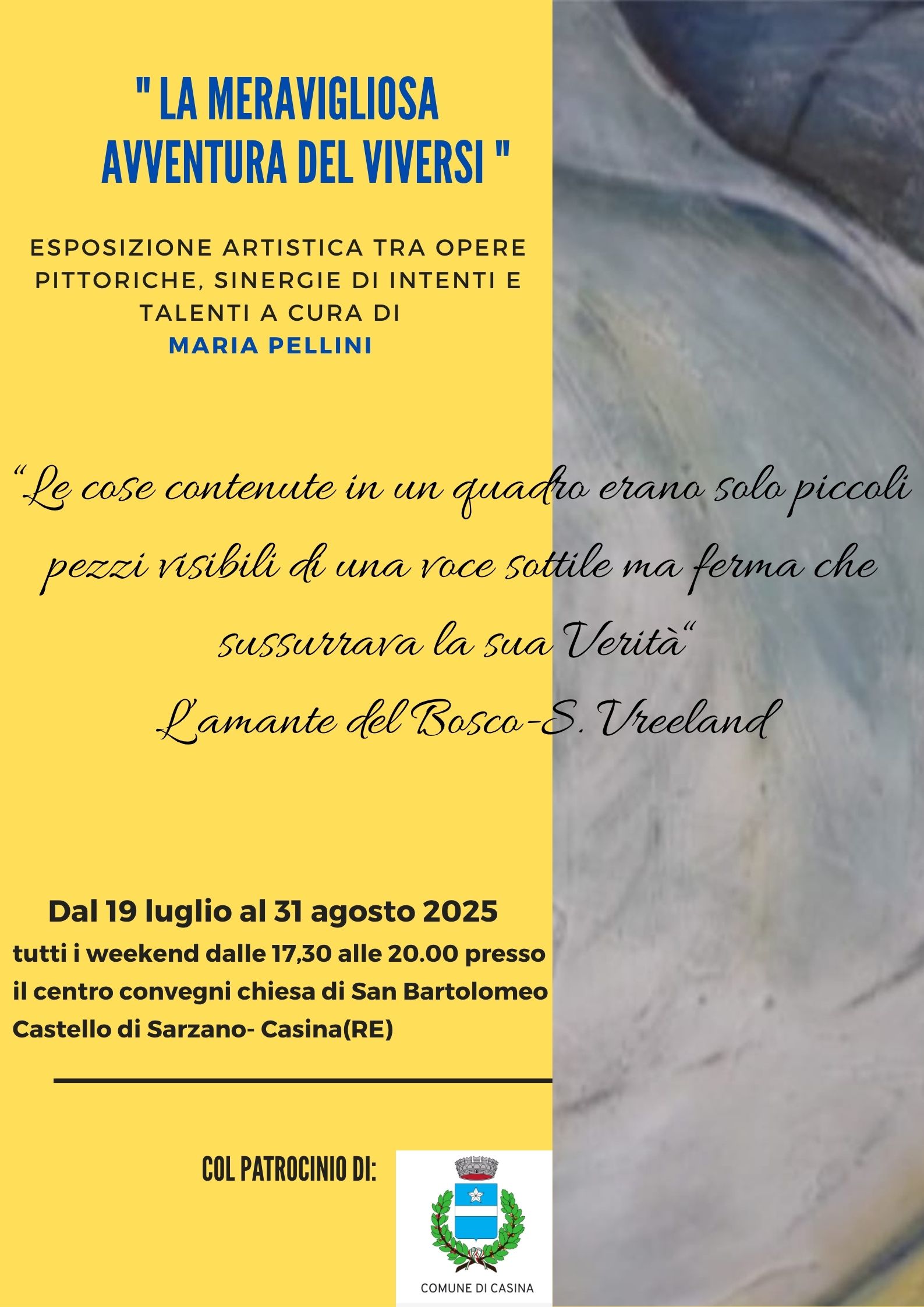 Il fine settimana sarà anche un viaggio nell’arte contemporanea: sabato 16 e domenica 17 agosto, nella Chiesa di San Bartolomeo a Sarzano, sarà visitabile la mostra La meravigliosa avventura del viversi, curata da Maria Pellini, un percorso tra opere pittoriche e sinergie creative che esplorano le forme del sentire autentico.