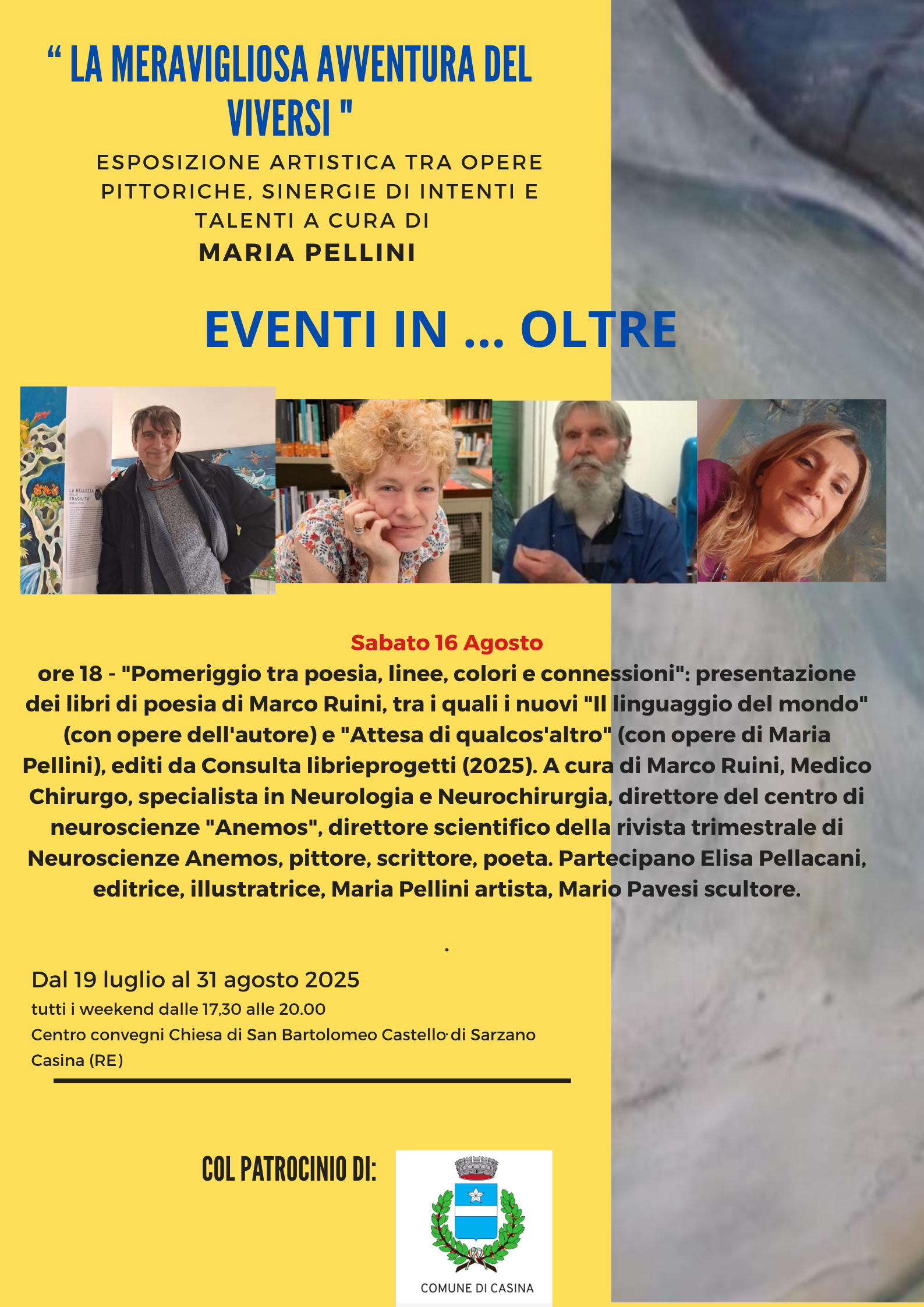 sabato 16 agosto, ore 18 – Pomeriggio tra poesia, linee e colori, un incontro tra letteratura, pittura e scultura con Marco Ruini, Elisa Pellacani, Maria Pellini e Mario Pavesi, tra letture, arte visiva e dialoghi creativi.
