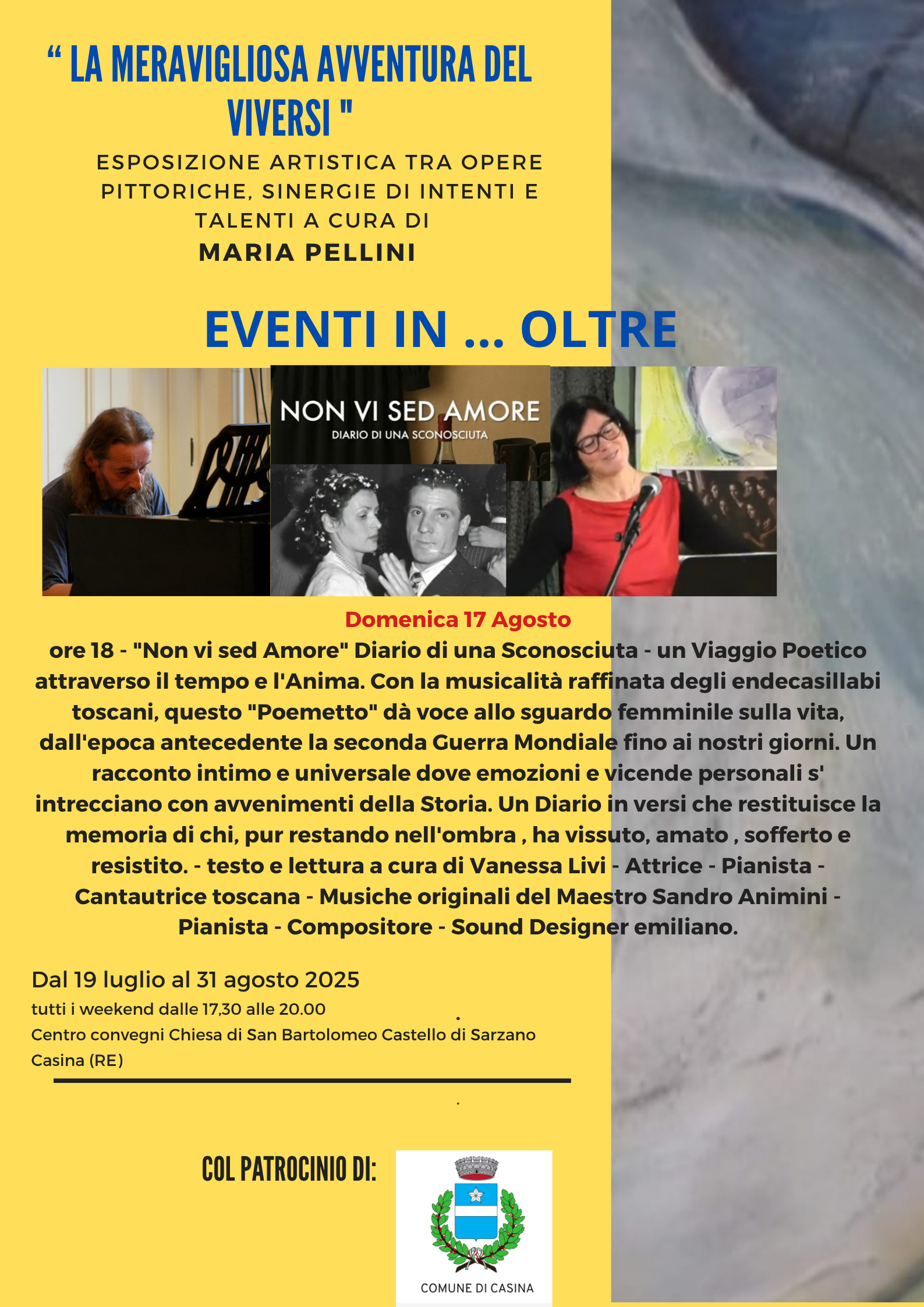 domenica 17 agosto, ore 18 – Non vi sed Amore, diario poetico-musicale di Vanessa Livi con le musiche originali di Sandro Animini, un viaggio intimo e universale tra memoria, emozioni e storia.