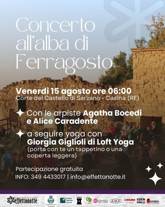 Venerdì 15 agosto, alle 6 del mattino, il silenzio dell’alba sarà interrotto soltanto dal suono limpido delle arpe di Agatha Bocedi e Alice Caradente, protagoniste del tradizionale e amatissimo Concerto all’alba di Ferragosto nella corte tra mastio e torre. Una cornice unica, dove le prime luci del giorno si fonderanno con melodie delicate, per un’esperienza suggestiva. A seguire, il risveglio del corpo e della mente con una sessione di yoga guidata da Giorgia Giglioli – Loft Yoga, per accogliere il giorno con energia e armonia. Iniziative a cura dell'associazione Effetto Notte.