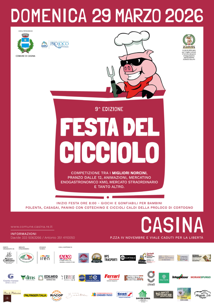 Domenica 29 marzo 2026 torna a Casina la 9ª Festa del Cicciolo: sfida tra i migliori norcini, degustazioni, mercato straordinario, animazioni e pranzo con specialità della tradizione. A cura della Pro Loco di Cortogno.