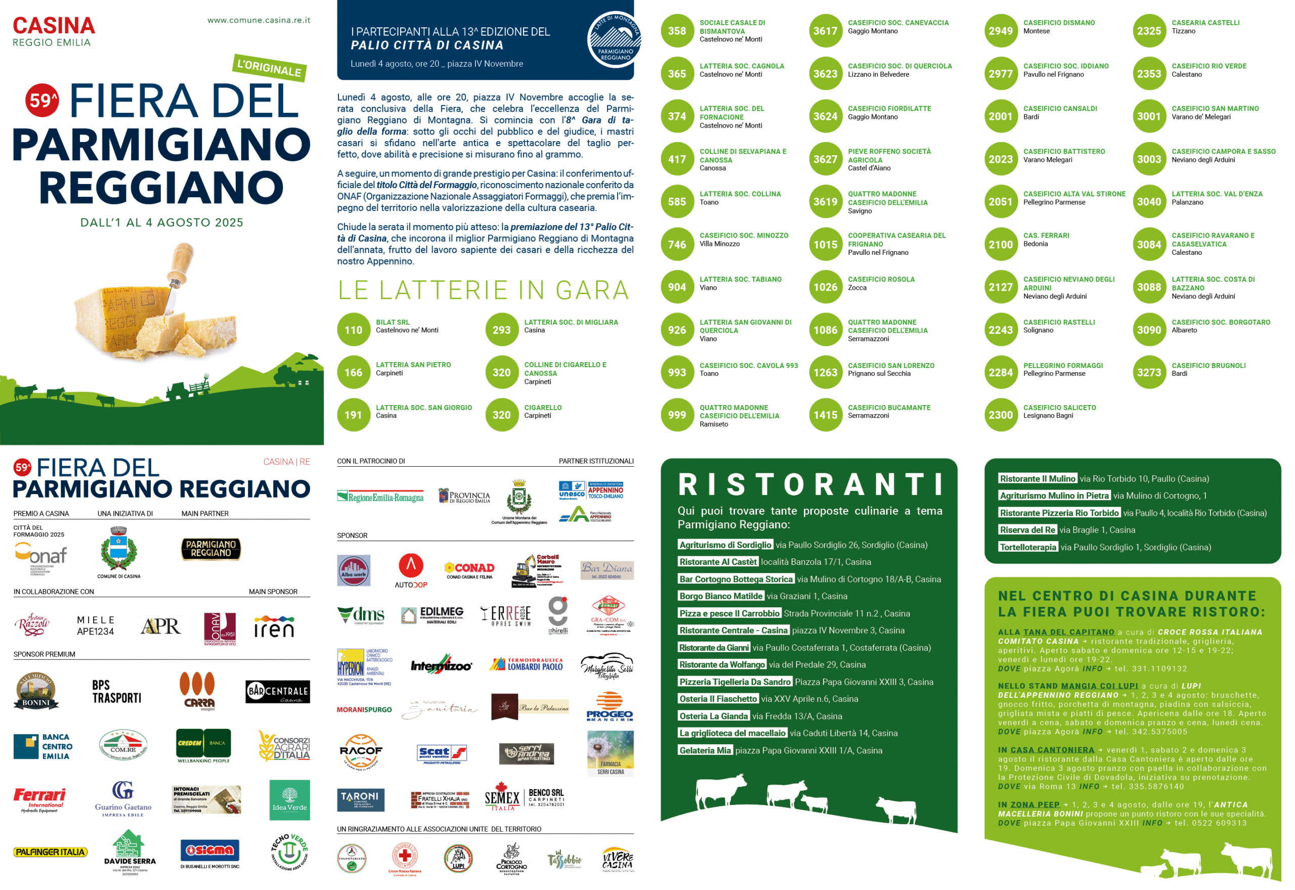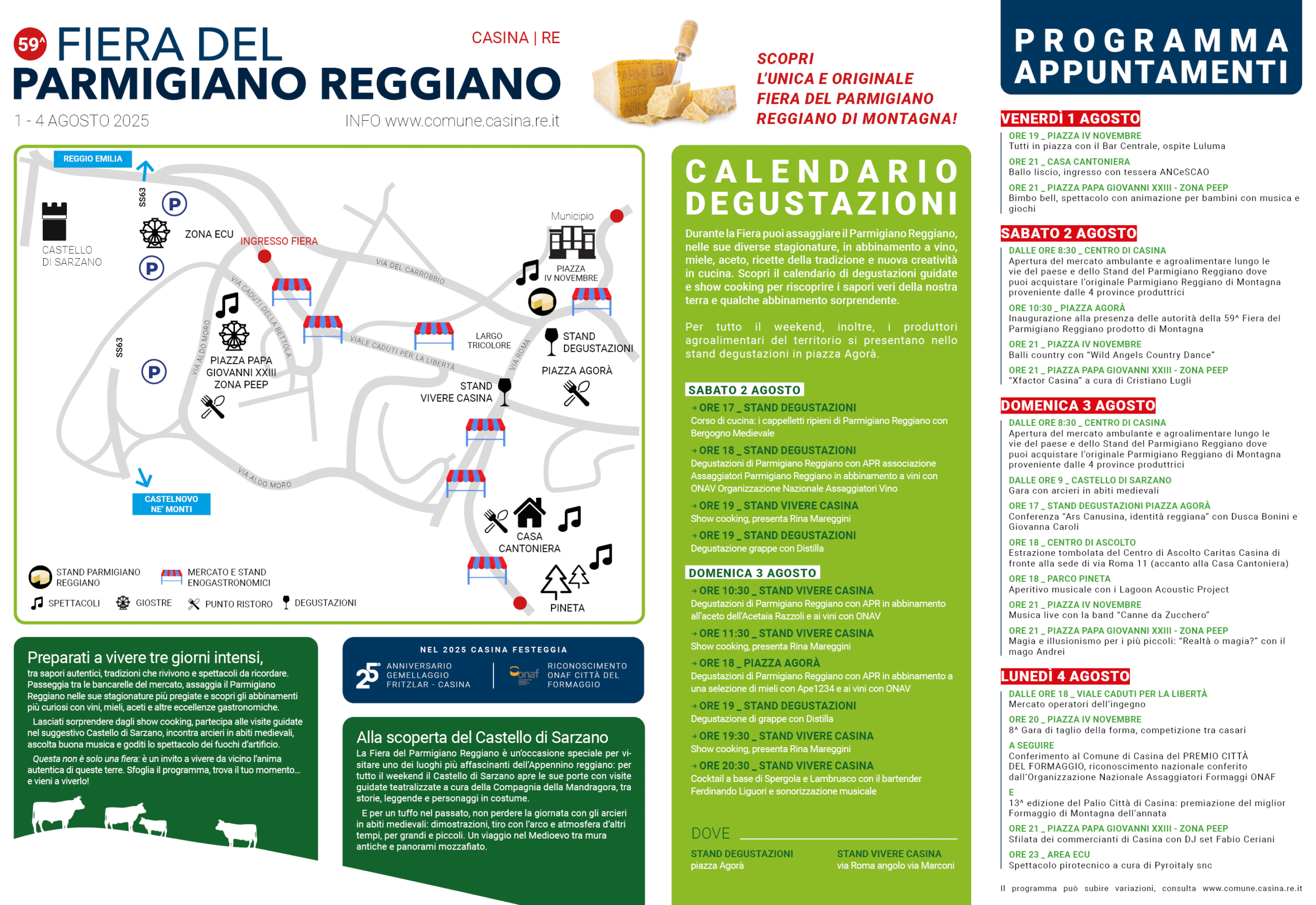 Quella che si svolgerà da venerdì 1 a lunedì 4 agosto sarà un’edizione speciale e importante per la Fiera del Parmigiano Reggiano di Casina. Questa 59esima edizione infatti non solo proporrà quattro giorni di grandi eventi, ottimo cibo, animazione, ma Casina verrà anche nominata ufficialmente Città del formaggio da parte di Onaf (Organizzazione Nazionale Assaggiatori Formaggio), un titolo che premia le località rappresentativa a livello nazionale per la produzione di Parmigiano Reggiano. Istituito nel 2020, l’Albo delle Città del Formaggio, che oggi conta 43 luoghi simbolo in Italia, intende riconoscere l'impegno del Comune nella promozione della propria tradizione casearia, il ruolo centrale che Casina ha nella produzione di formaggio della dorsale appenninica e il lavoro intrapreso per comunicare questa identità proprio tramite la fiera. Fiera che sarà, come sempre, un’occasione imperdibile per vivere da vicino l’autenticità di un territorio dove gusto, tradizione e cultura si intrecciano in un programma ricco e coinvolgente. Per tutto il weekend sarà possibile assaggiare il Parmigiano Reggiano nelle sue diverse stagionature nello stand del Parmigiano Reggiano in via Roma, scoprirne gli abbinamenti più curiosi con miele, vini, aceti e grappe, visitare il Castello di Sarzano con guide in costume medievale, assistere a concerti, esibizioni e spettacoli pirotecnici.