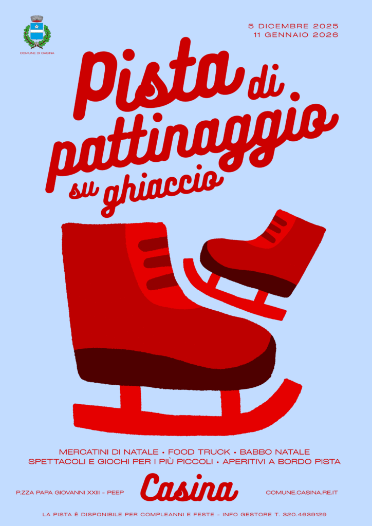 Il Natale 2025 a Casina si accende con la nuova pista di pattinaggio al Peep, mercatini, spettacoli, animazioni e appuntamenti per grandi e bambini. Un villaggio natalizio diffuso con eventi anche a Leguigno, Casa Cantoniera, Bergogno e Palestra Comunale.