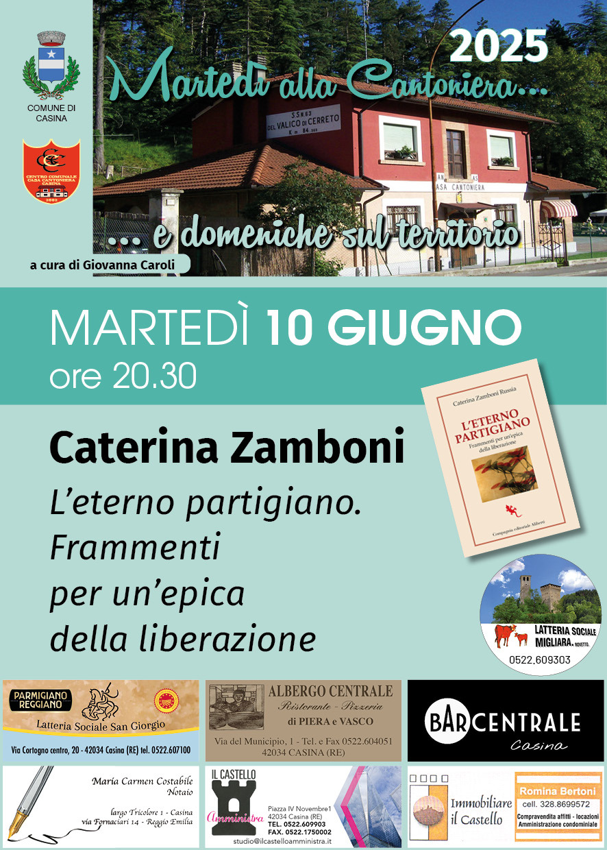 Questa sera, martedì 10 giugno 2025, alle ore 20.30, presso la Casa Cantoniera di Casina, si terrà un incontro con l’autrice Caterina Zamboni, che presenterà il suo libro L’eterno partigiano. Frammenti per un’epica della liberazione (ed. Aliberti). L’iniziativa, curata da Giovanna Caroli, è patrocinata dal Comune di Casina. Un’occasione preziosa per riflettere sulla memoria della Resistenza attraverso una narrazione intensa e coinvolgente.