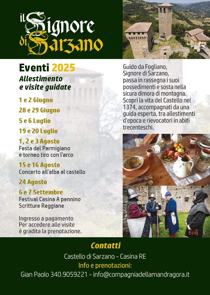 Guido da Fogliano, Signore di Sarzano, passa in rassegna i suoi possedimenti e sosta nella sicura dimora di montagna. Scopri la vita del Castello nel 1374, accompagnato da una guida esperta, tra allestimenti d'epoca e rievocatori in abiti trecenteschi.